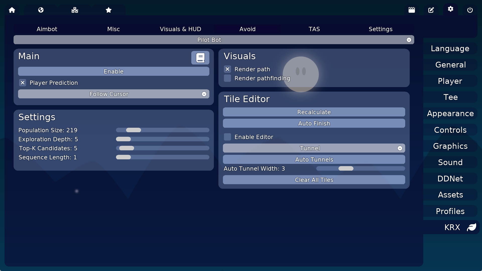 Discover the Pilot Bot in KRX Client for Teeworlds. Learn how to configure its autonomous navigation modes, performance settings, and visual aids for advanced automated gameplay.